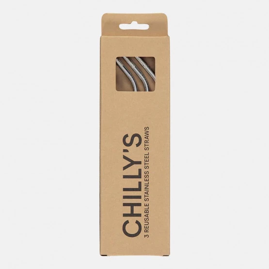 Συσκευασία με τρία, υψηλής ποιότητας επαναχρησιμοποιούμενα καλαμάκια από ανοξείδωτο χάλυβα, σχεδιασμένα σύμφωνα με την αποστολή της Chilly’s, να συμβάλει στη μείωση της κατανάλωσης πλαστικών μιας χρήσης.